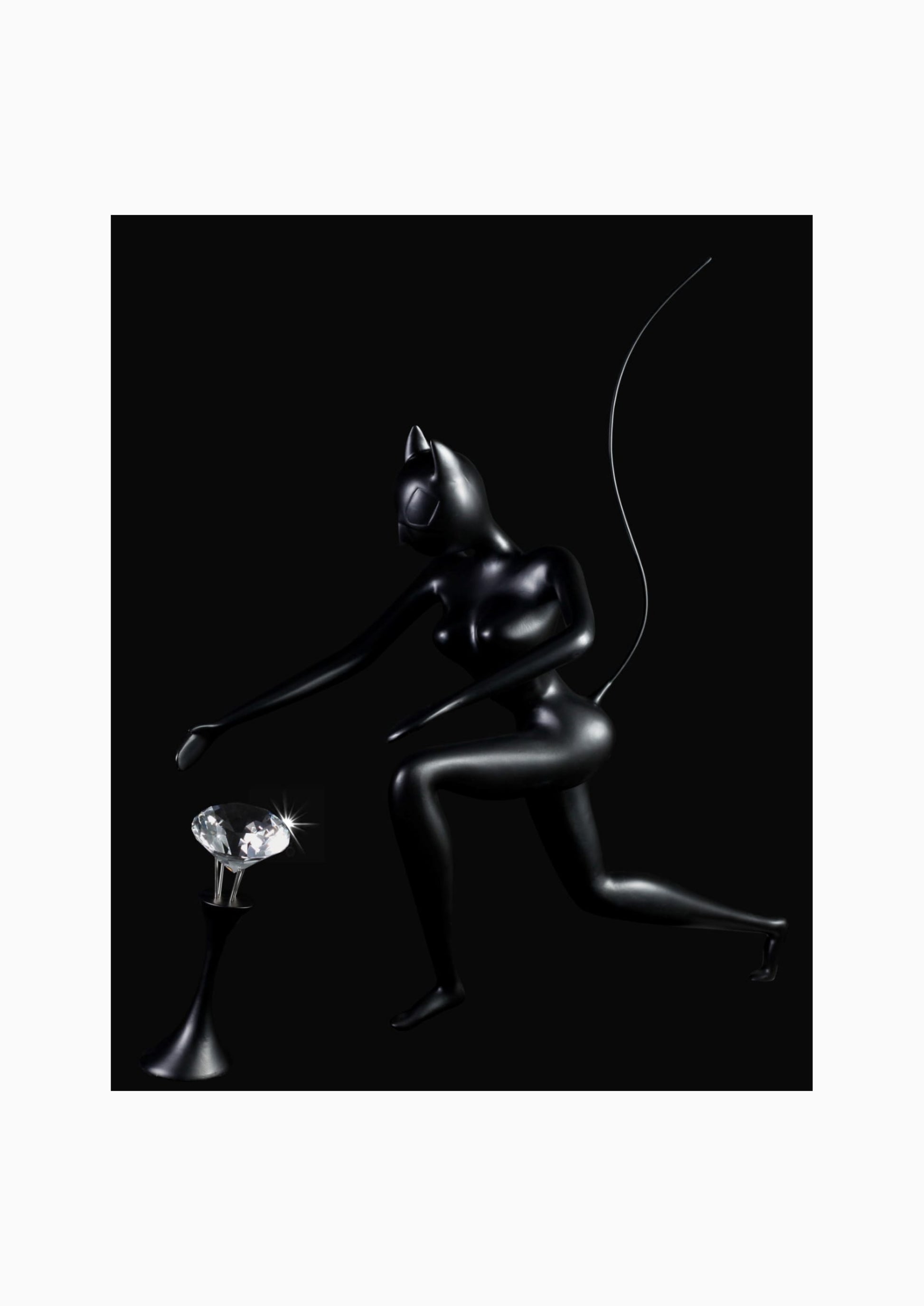 Cat Woman est une sculpture en résine et fibre de verre, mesurant 70 cm de haut et produite à seulement 8 exemplaires. Avec ses lignes épurées et sa silhouette féline, elle incarne une puissance sensuelle et mystérieuse. Le noir lustré de la matière souligne son élégance tout en renforçant l’aura énigmatique de l'œuvre.