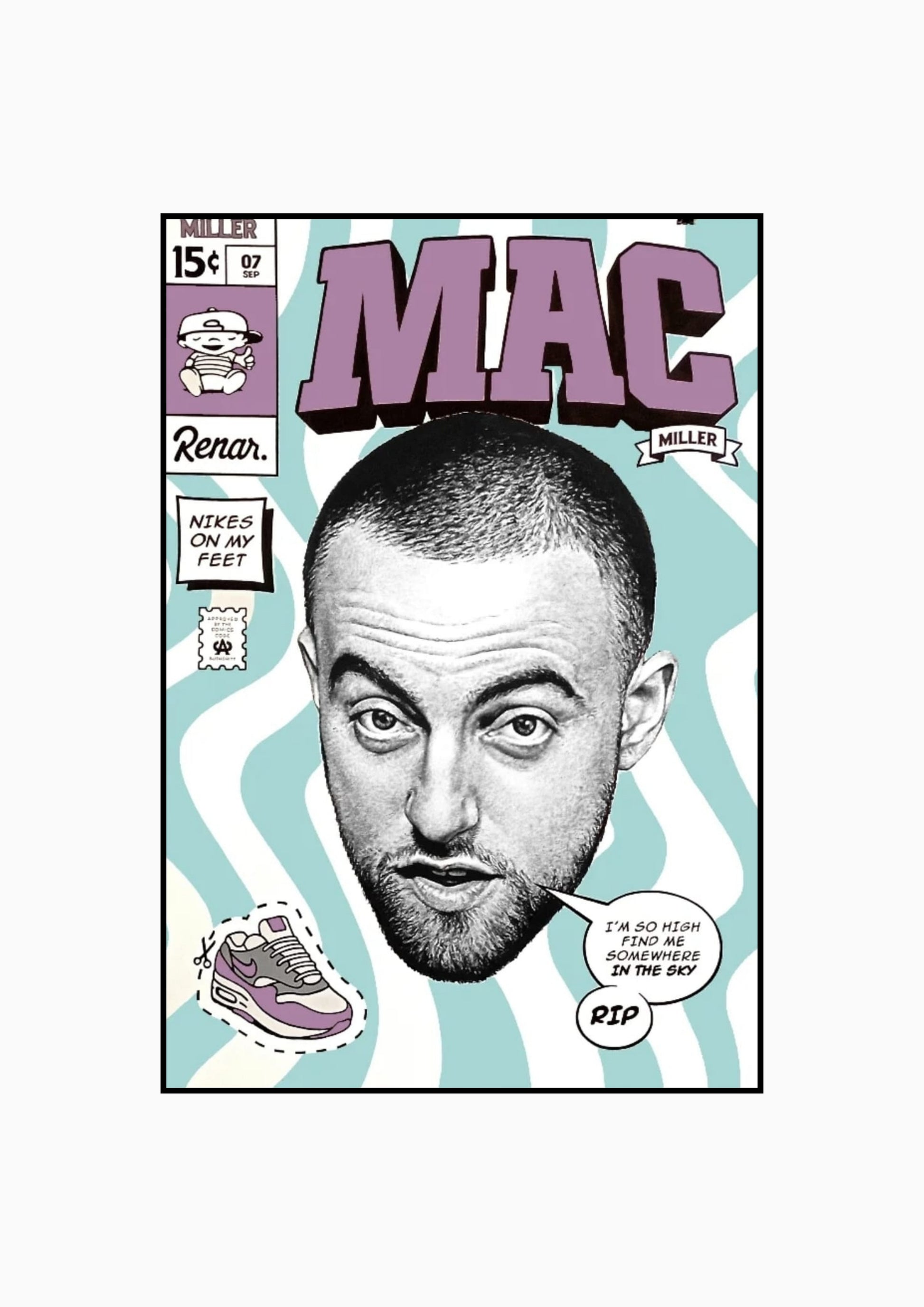 Portrait de Mac Miller, rappeur américain, réalisé à l’acrylique sur papier Canson. Entièrement peinte à la main, l’œuvre est présentée dans un cadre en aluminium avec une protection en verre. Elle mesure 100 x 70 cm.