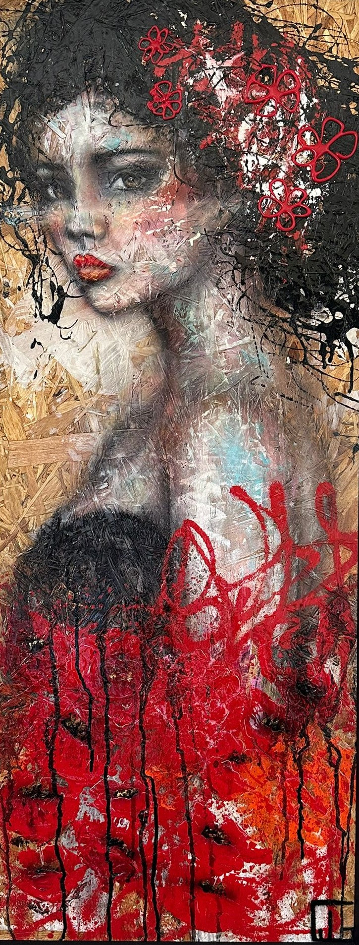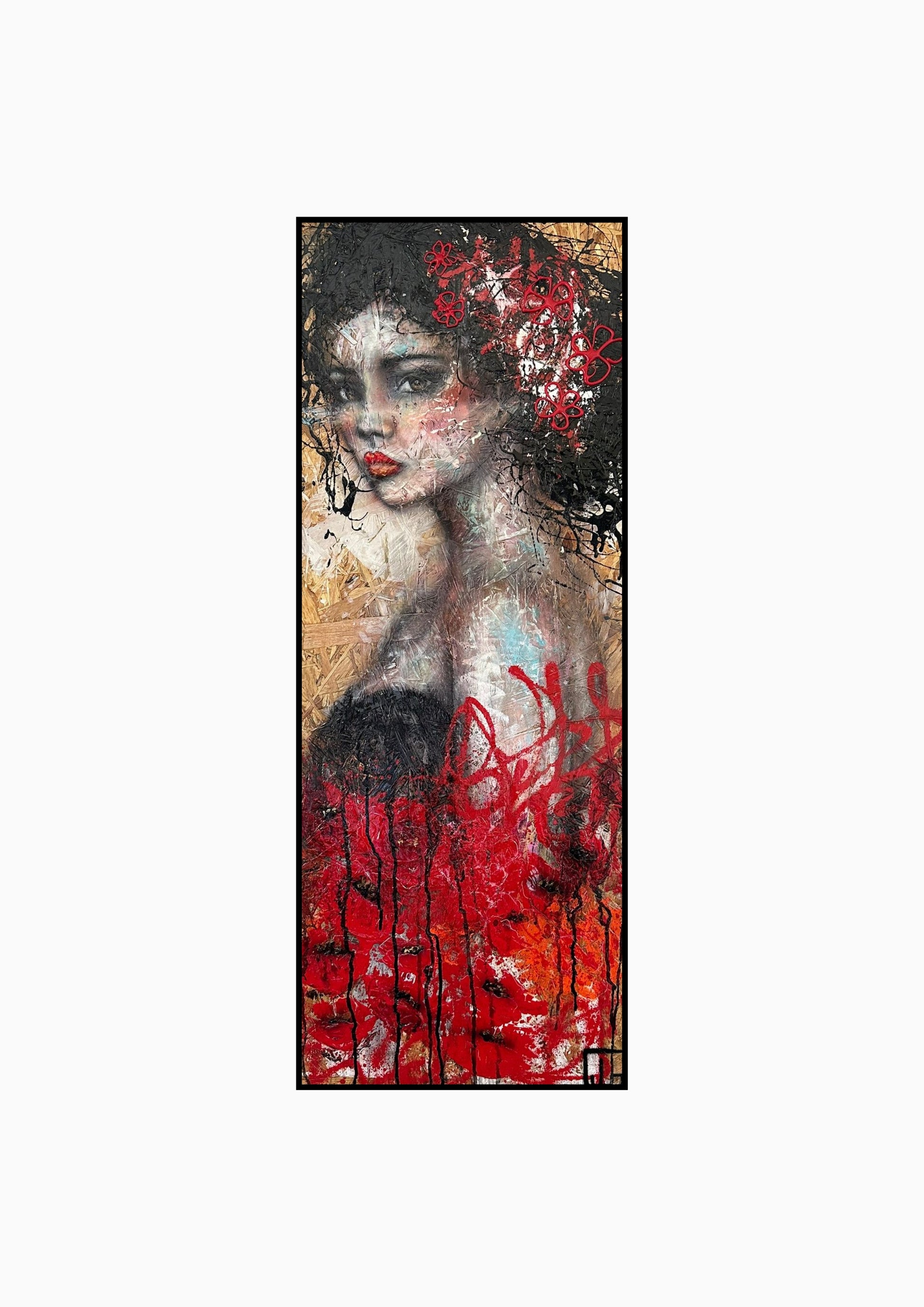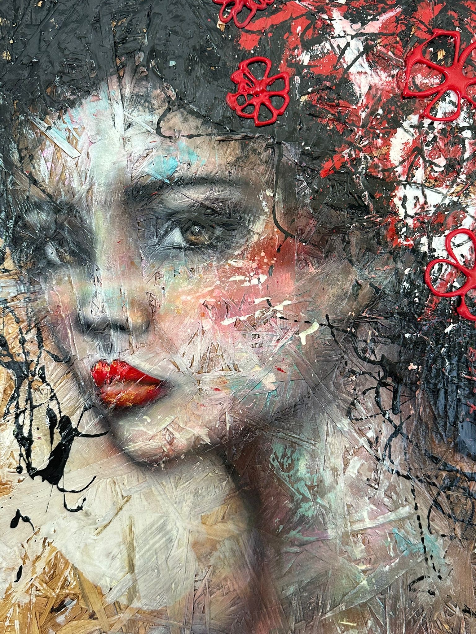 Red Horizon est un tableau peint à l’aérosol sur une plaque de bois OSB. Des fleurs en résine ont été apposées par l’artiste, ainsi qu’une laque de carrossier. L’œuvre, présentée dans un cadre en aluminium, fait partie de la série « C’est la vie » et mesure 100 x 40 cm.