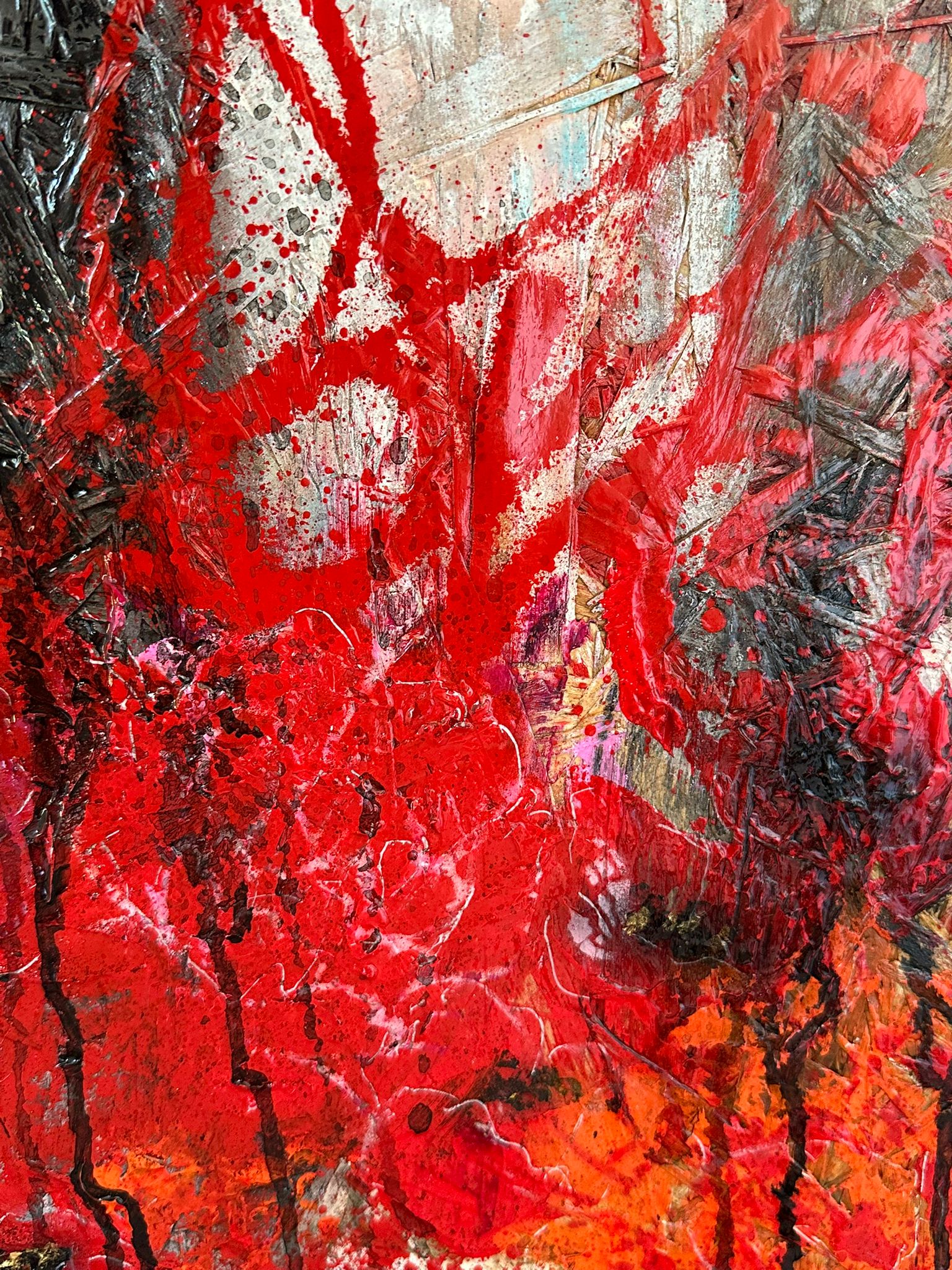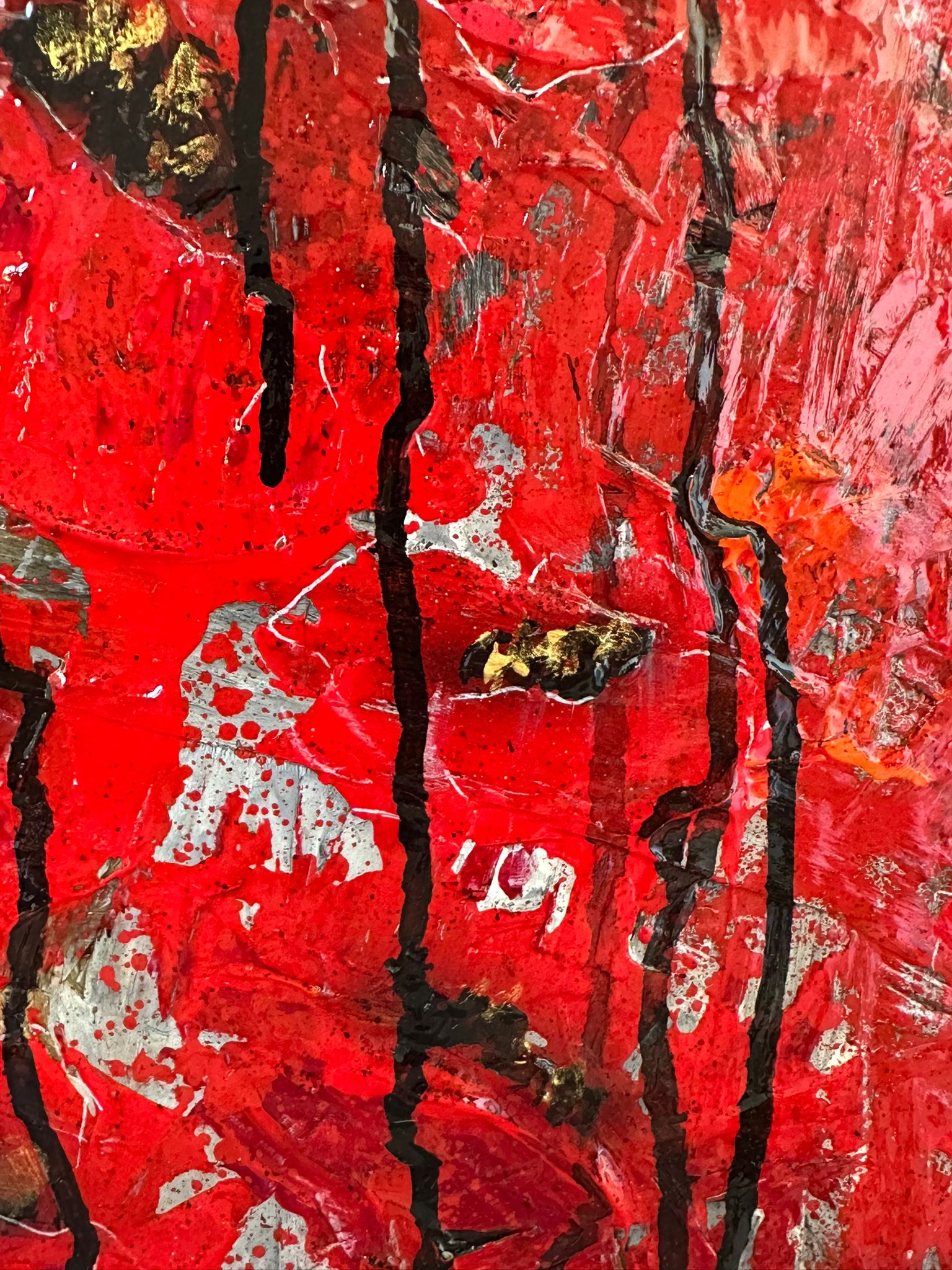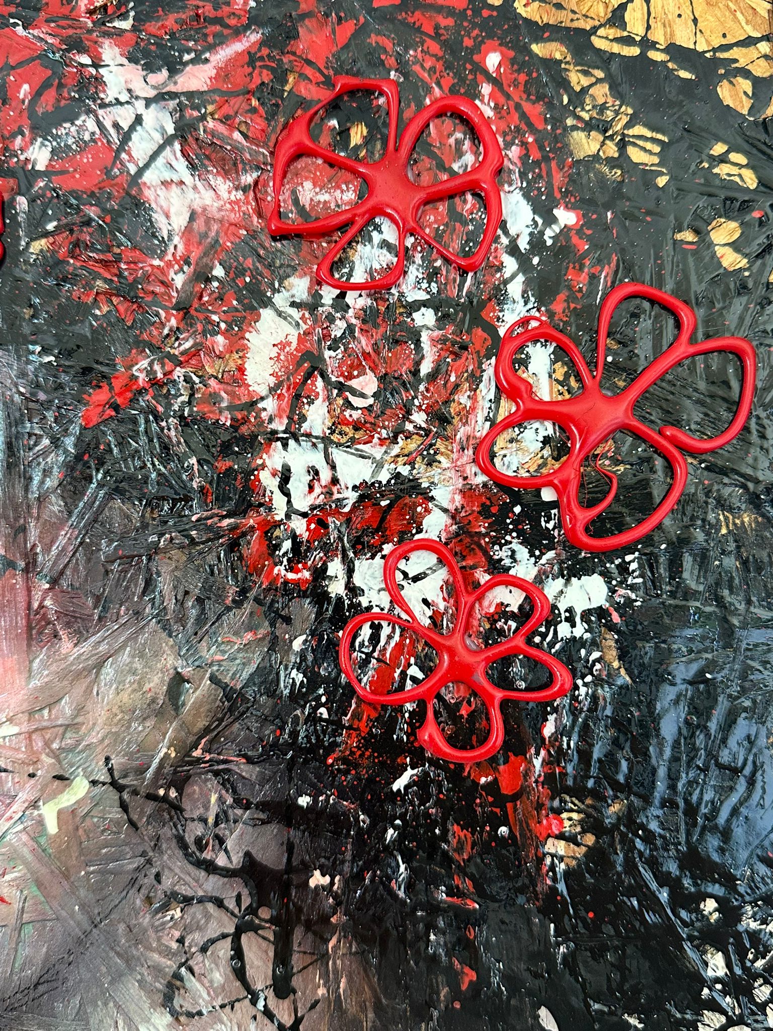 Red Horizon est un tableau peint à l’aérosol sur une plaque de bois OSB. Des fleurs en résine ont été apposées par l’artiste, ainsi qu’une laque de carrossier. L’œuvre, présentée dans un cadre en aluminium, fait partie de la série « C’est la vie » et mesure 100 x 40 cm.