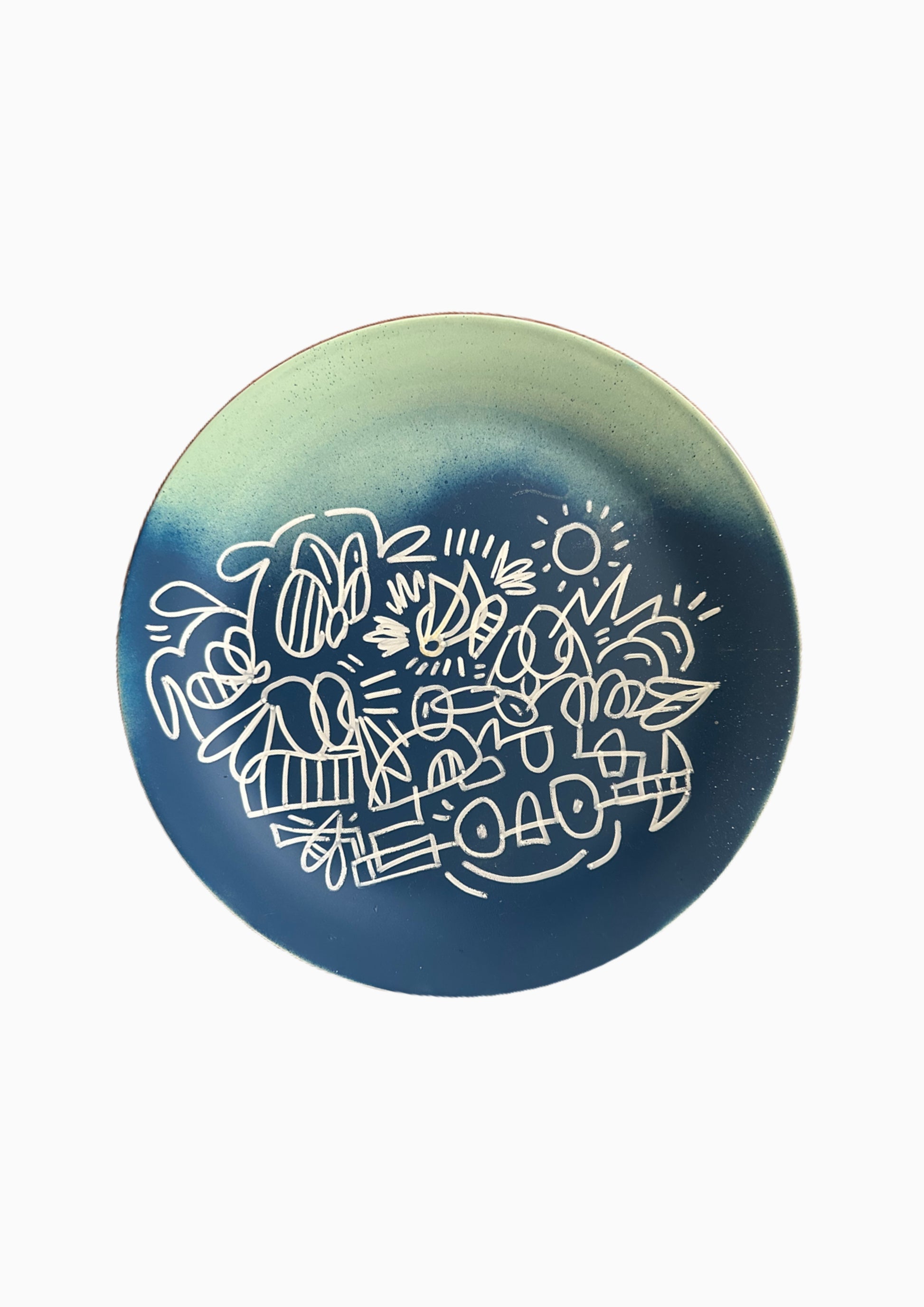 Cette assiette est une création de RITS, réalisée à l’aérosol et au feutre Posca blanc sur un support en bois. Les motifs fluides et délicats, inspirés de la nature, contrastent avec le fond bleu profond, créant une harmonie entre modernité et tradition artisanale.