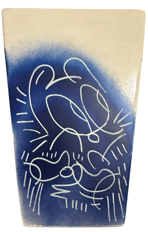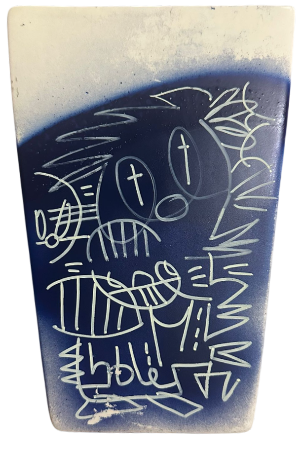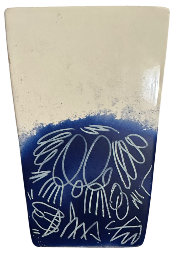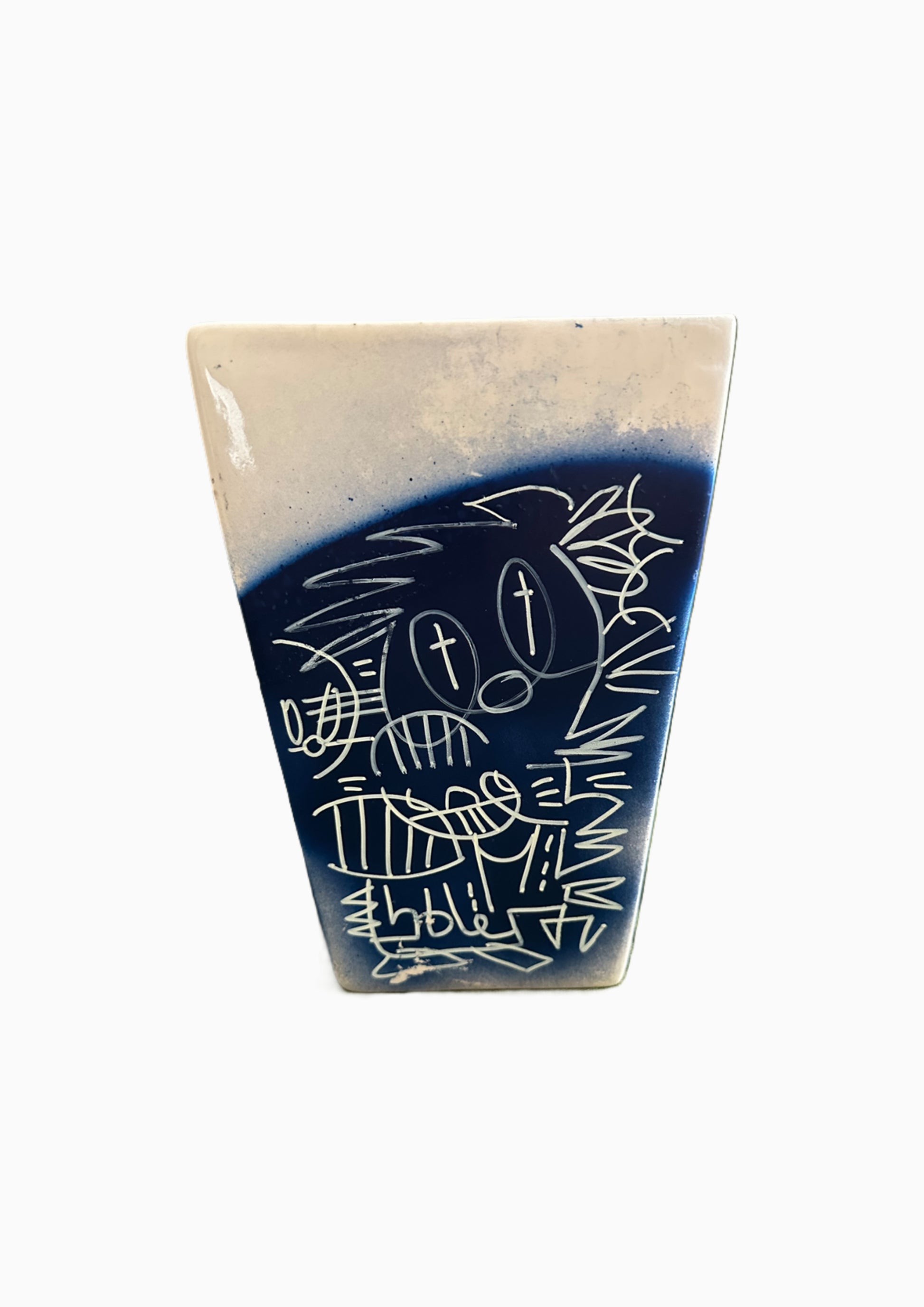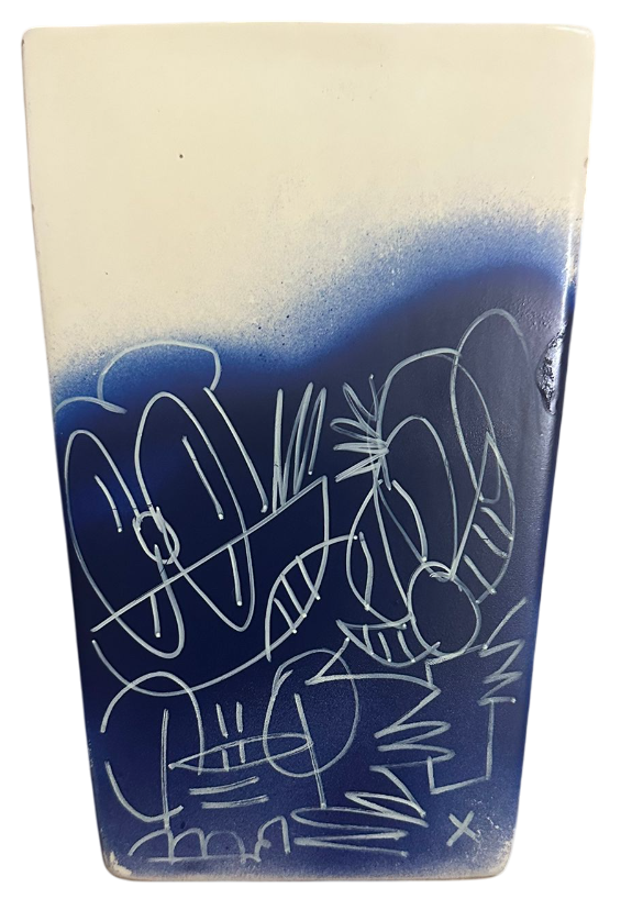 Ce vase est une création de RITS, réalisée à l’aérosol et au feutre Posca blanc. Les motifs abstraits et spontanés, traçant des formes et des symboles, se détachent sur le dégradé bleu, mariant énergie urbaine et élégance visuelle.
